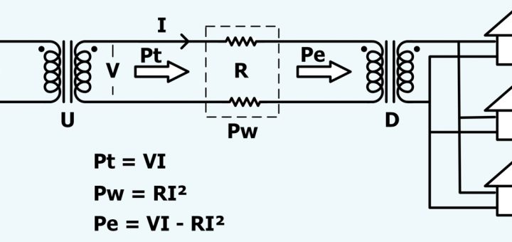 (Reprezentare schematică a transmisiei electrice pe distanțe lungi C = consumatori, D = transformator coborâtor de tensiune, G = generator, I = curent în fire, Pe = puterea care ajunge la capătul liniei de transmisie, Pt = puterea de intrare în linia de...