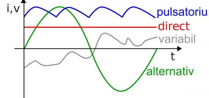 Curentul continuu este prezentat de linia roșie Curentul alternativ de linia verde Axa verticală indică curentul sau tensiunea, iar axa orizontală „t” măsoară timpul și indică valoarea zero. Curent continuu Curentul continuu (CC) este fluxul unidirecțional al sarcinilor electrice. O baterie este un bun exemplu...